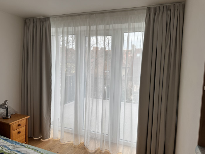 Realizace zatemňujících závěsů a záclonek v kombinaci s bateriovými roletami a plisé žaluziemi