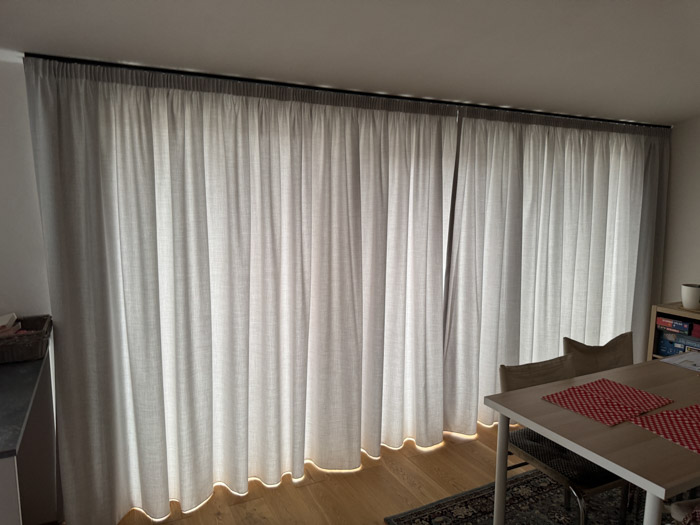 Po montáži se závěsy a záclony aranžují do finální podoby. To zahrnuje nařasení, úpravu délky a celkovou prezentaci, aby dokonale ladily s interiérem.