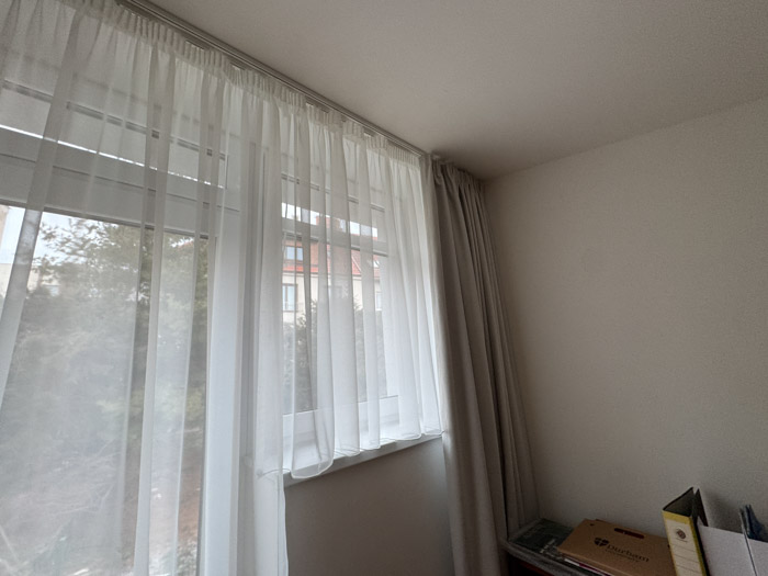 - na míru ohýbané kolejnice, spolu se závěsy a záclonkou, elegantně skryly rohové okno