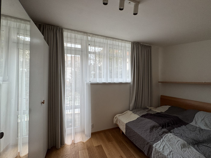 - v ložnici je kolejnice ohnuta i po stranách ke stěně, aby zajistila maximální zatemnění